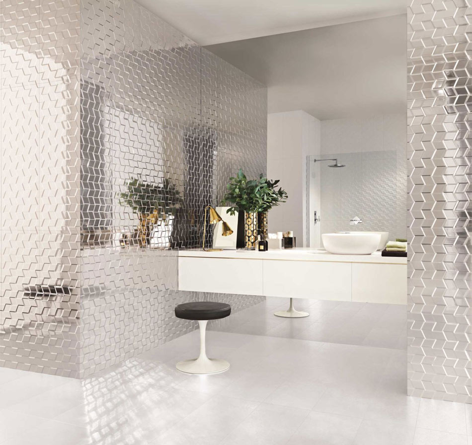 A smaller bathroom gets a modernist twist (and a larger look) with three-dimensional plaster-look tile. A double herringbone layout helps the backsplash extend up and out, while the cool-white hue catches light. The look is both traditional and innovative, playful and sophisticated.