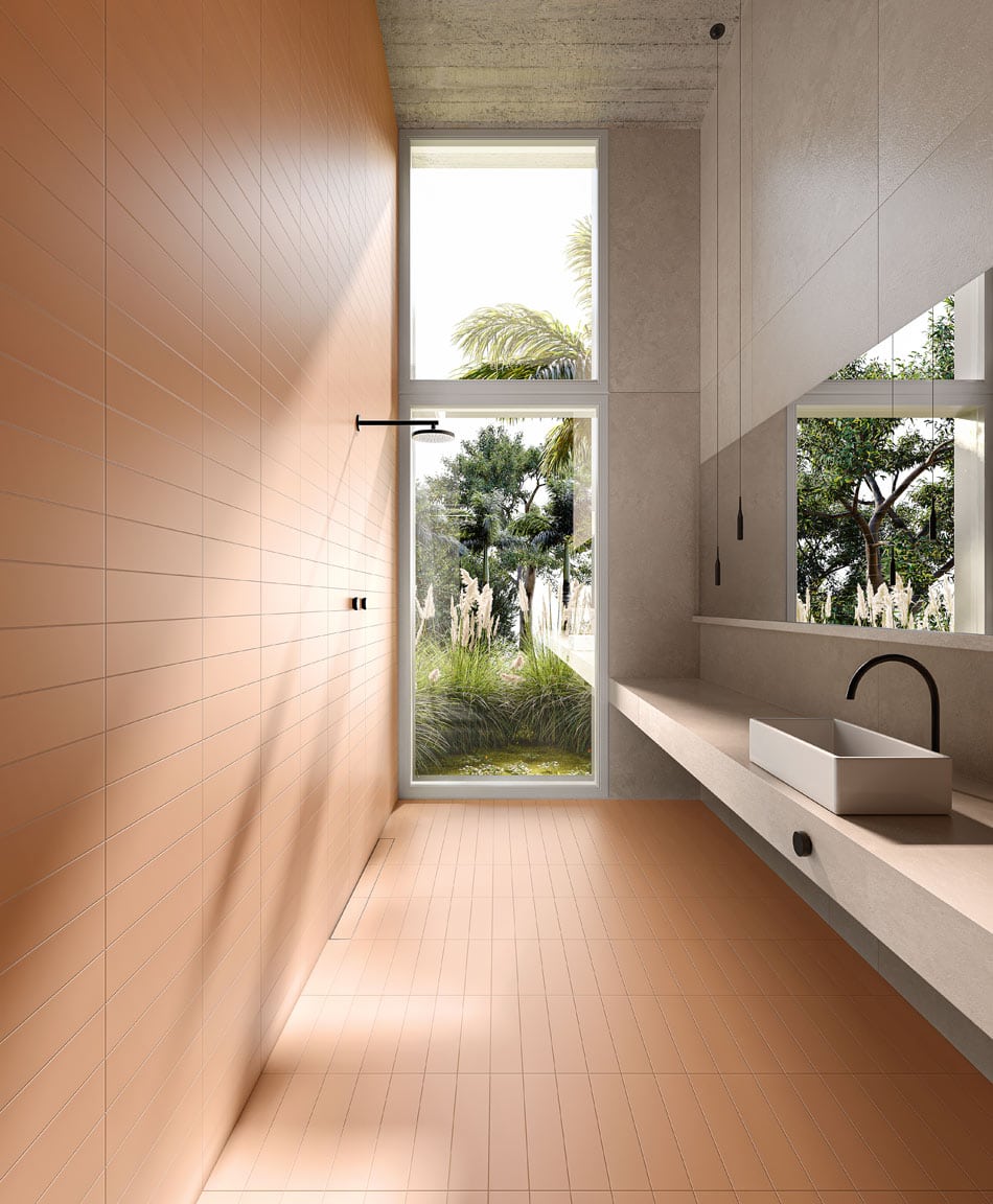 Narrow room? No problem. Matte peach wall tile flows to the floor in the same vertical layout. The result is an unbroken aesthetic that lengthens the shower space and enhances its height. Neutral concrete-look backsplash tile balances the blush and helps surfaces gently gleam.