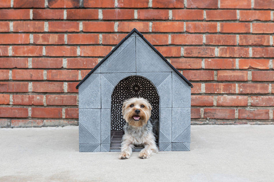 Half-and-half grooved tile forms a diamond pattern on the facade of this stylish tiled doghouse. A black tile roof handles the weather. Black-and-white tile adorns the interior wall. Gray brick-look tile forms a sturdy floor. It’s a house fit for a queen (we’re a little jealous).