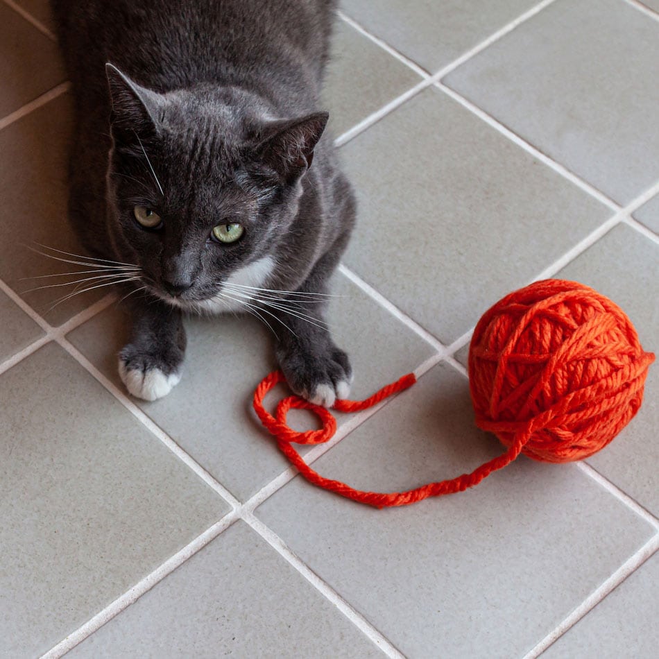 Greige concrete-look tile sits in a grid as white grout outlines orderly squares. A rather intense-looking tuxedo cat bats yarn as much as she wants without scratching the surface.