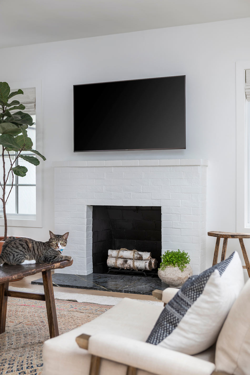 This cozy living room boasts white brick-look tile around a fireplace, while a bold black marble-look tile slab creates a minimalist hearth. The black-and-white combo is a lovely complement to light pine-look floor tile. The result is contemporary farmhouse decor with a twist.