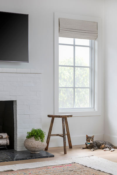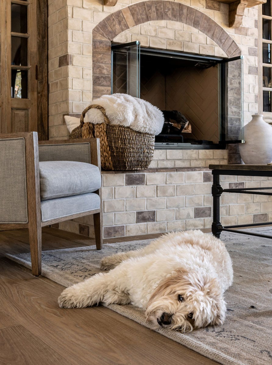 Wood-look floor tile meets a limestone brick-look tile fireplace surround for a fantastically warm space. Our fuzzy friend clearly loves it, while that long hair sweeps away easily. Even his coat and the decor color schemes are in sync. A washable rug gives Rover extra cush.