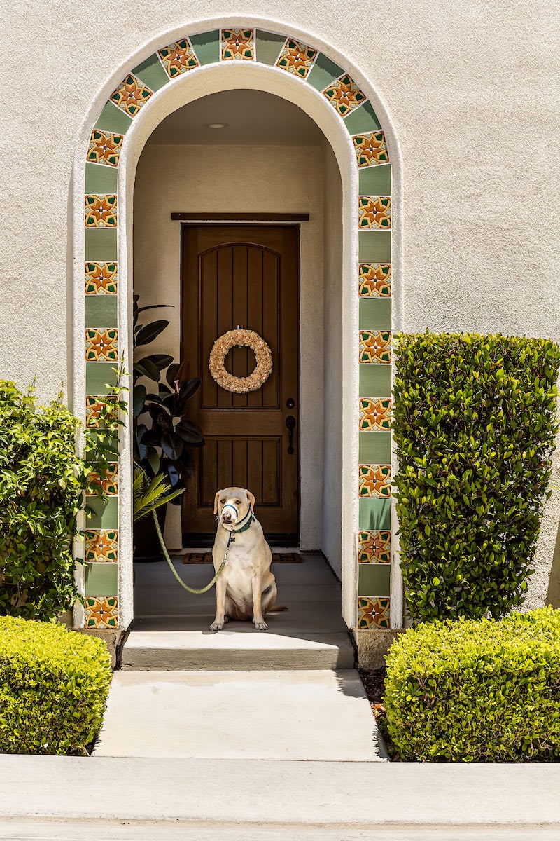 Handpainted glazed tile graces this arched entrance in sage and orange starbursts. Ceramic tile stays strong under conditions from snow to sunshine. And a lab waits patiently to hit the ground running.