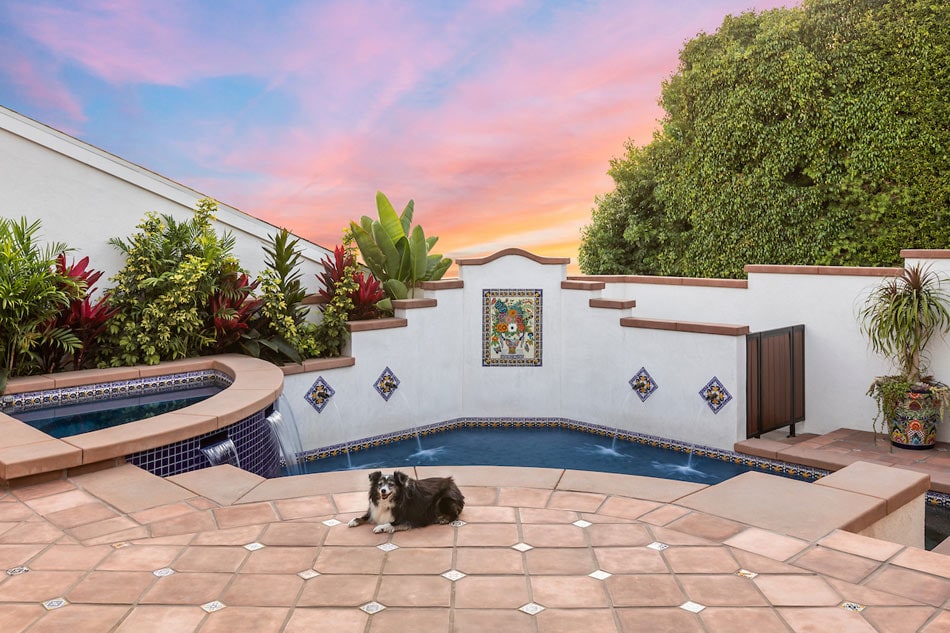 This luxe Southwestern-inspired patio and pool positively glow. A warm terracotta-look tile patio is punctuated with patterned diamond tile. The fountain and mini-pools shine with handpainted tile borders and accents, while a royal blue mosaic dons the pool interior. The intricate tile mosaic floral centerpiece is nothing short of stunning. One happy border collie takes a dip anytime he wants.