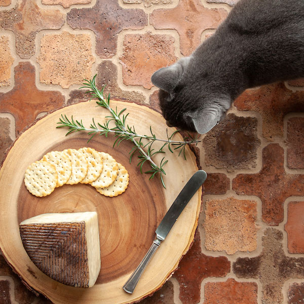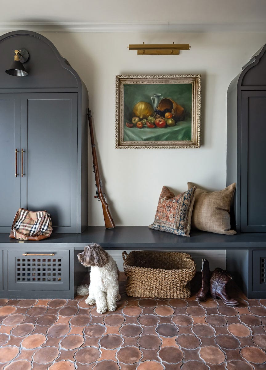 Textured stone-look tile in terracotta hues lies in a square-and-cross mosaic on the floor. It’s au naturel, rustic, and a bit Old World: chic and durable under foot (and paw) traffic. A stately Russian blue cat creeps up for just a bite of brie.