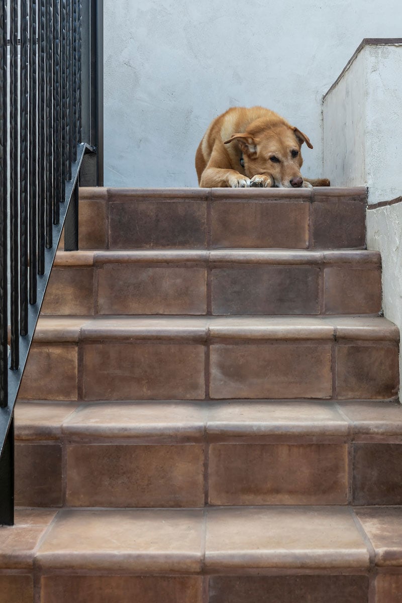 Thick brown tile treads wrap these stairs, slip-resistant and immune to fading. Luna rests at the top, but your stairs are safe when she decides to bound up and down.