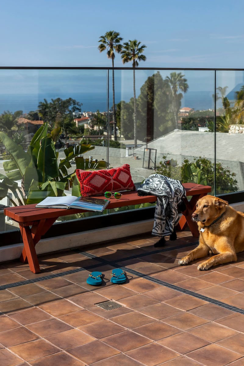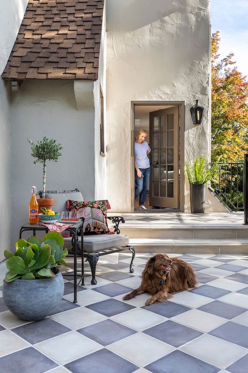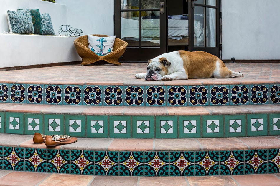 Outdoor patio stairs get a striking upgrade with patterned tile, chic in shades of green, black, and red. It’s an ideal pairing with light terracotta-look floor tile, matte and warm under the open sky. Meanwhile, Margo cools her belly in bliss.