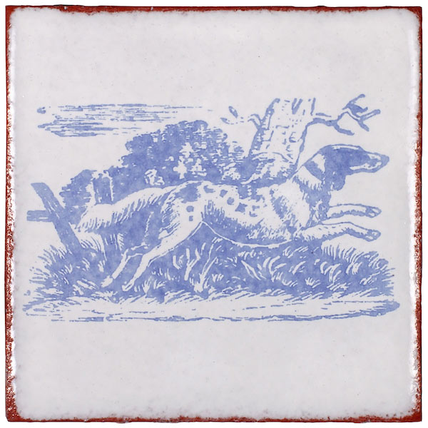 This Delftware tile shows an English setter mid-hunt. After all, we love our dogs, and we love our decorative tile. Why not put them together in a mini-portrait?