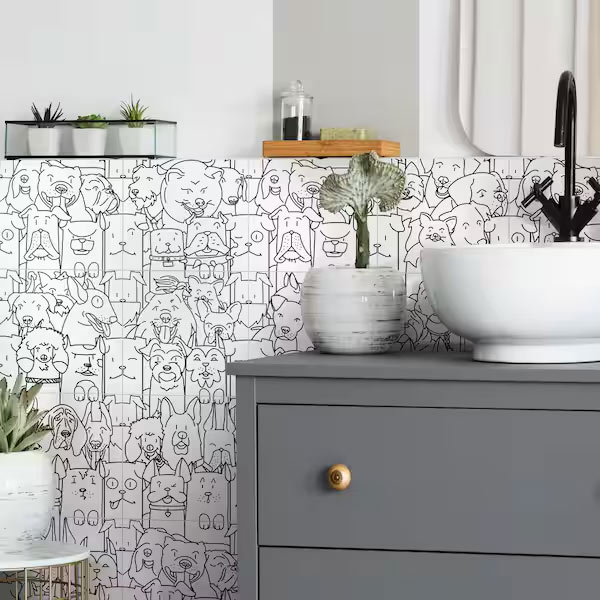 A porcelain tile backsplash takes a pop-art turn to show a plethora of dog breeds. The sketchbook look is playful and trendy, while your bathroom remains as impeccable as ever.