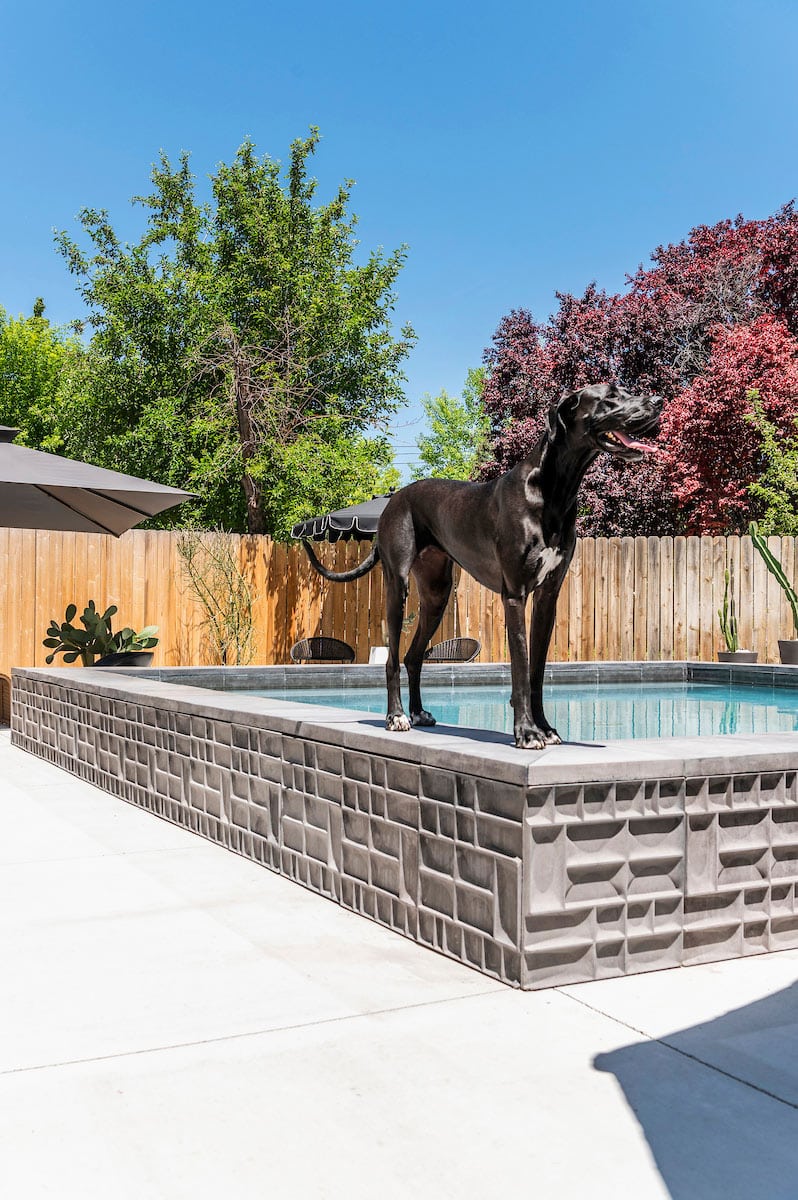 This pool couldn’t get more distinguished, clad with sculpted gray concrete-look tile in dramatic courses. XXL ivory panels blanket the pet-friendly flooring and make the patio seem even bigger. A big dog needs a wide space, and this sleek Dane stands guard under the sun.