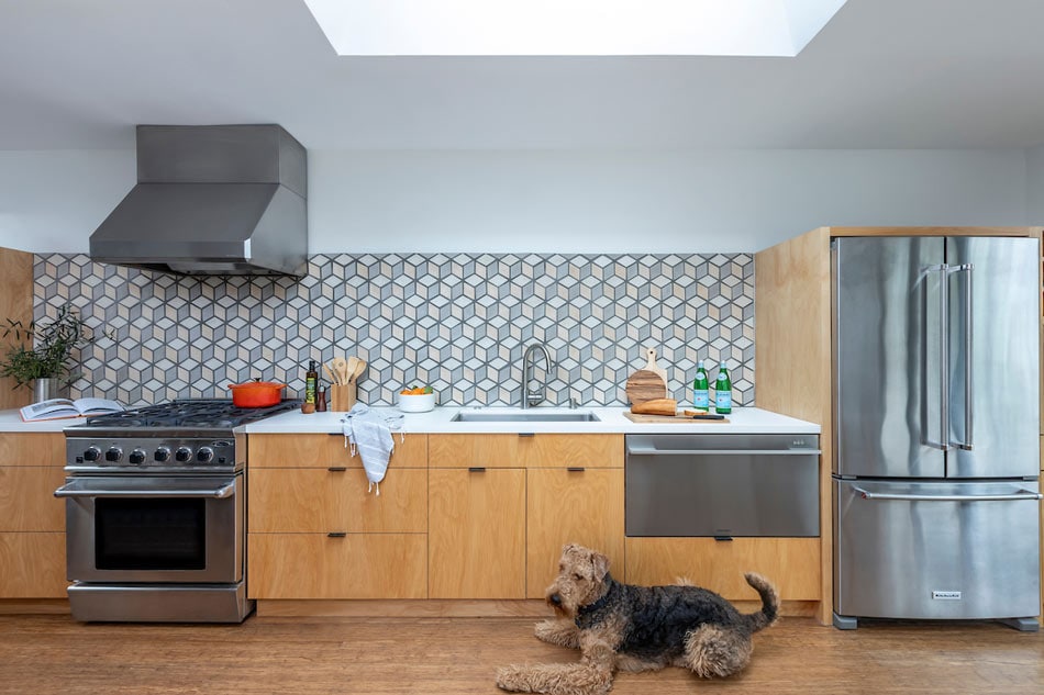 A ceramic tile backsplash in a diamond pattern makes this kitchen pop with the illusion of cubes. Golden wood-look tile tops the floor and perfects a modern, eclectic aesthetic. An Airedale terrier sits calmly, waiting on whatever treats may fall. Pro tip: Spills won’t stain the tile.