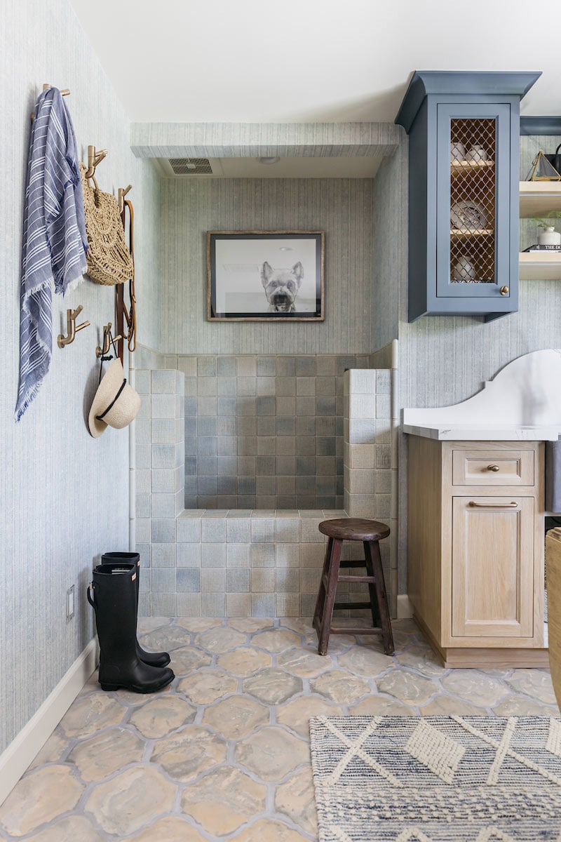A pet shower is convenient (and desirable) for both you and your fur babies. Linen-look tile covers the shower interior and exterior in demure shades of gray, blue, and beige. Neutral arabesque floor tile adds soft, dancing juxtaposition. But the pup seems to have reservations.