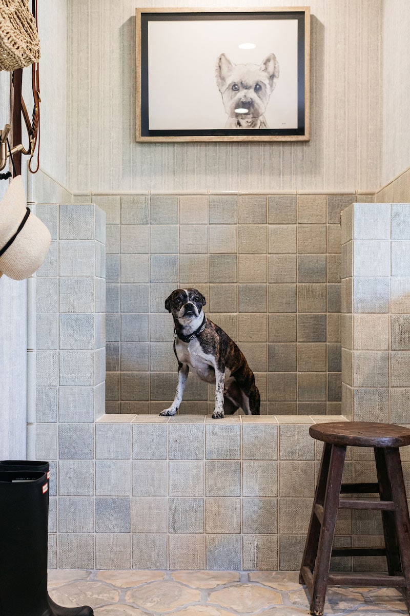 Suds, soaps, and fur are no problem. A sturdy stone-look tile dog shower takes the pressure with a touch of industrial chic. And look how happy this gal is to be getting her hair done.