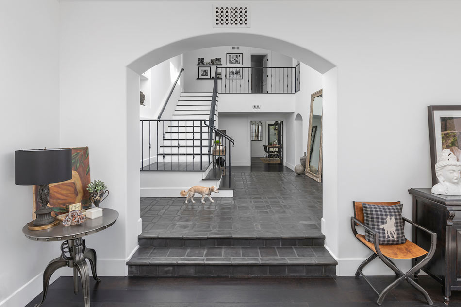 Monochrome design creates modernist sophistication in this living space. Molded ash-gray floor tile in a picket-meets-square layout adds depth. Black walnut-look tile atop the stairs, lower-level floor, and dining room quietly complements the whole. And a pup gingerly explores while all surfaces stay pristine.