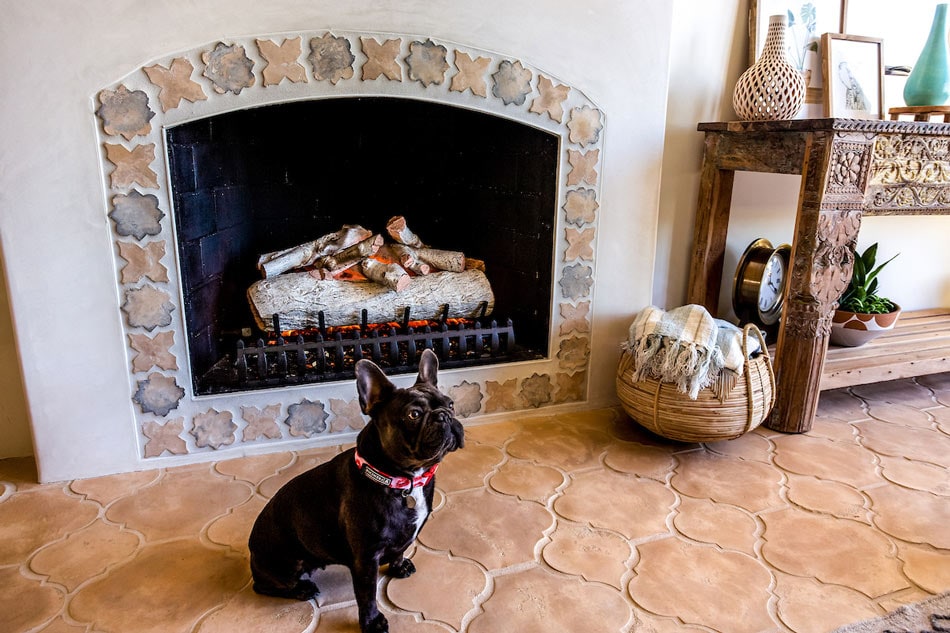Oui, mon cher. This Frenchie poses intently atop arabesque terracotta-look floor tile. Earthy colors saturate tile insets around the fireplace, adding a distinctly European flair to this space.