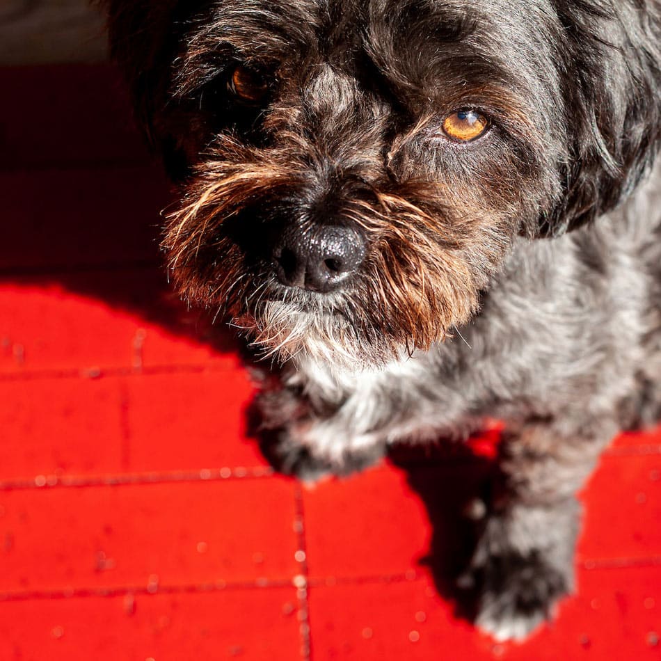 Glazed brick-look tile in cadmium red gleams under bright sunshine. Its realistic texture gives the floor a dose of authenticity, appearing “weathered” without being actually worn. That invigorating scarlet stays saturated, whether this contemplative guy’s snoozing or romping.