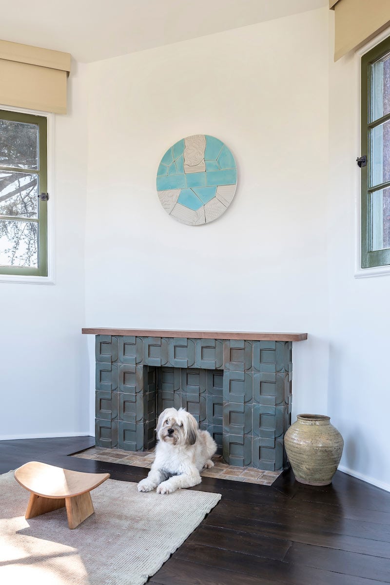 Fireplaces and pets make one of the coziest pairs around. Matte-black floor tile with gentle undulated texture resists messes as well as stray sparks. A gray tile-cladded fireplace surround takes the room to an elegant, modernist level. Fido’s feeling fine.