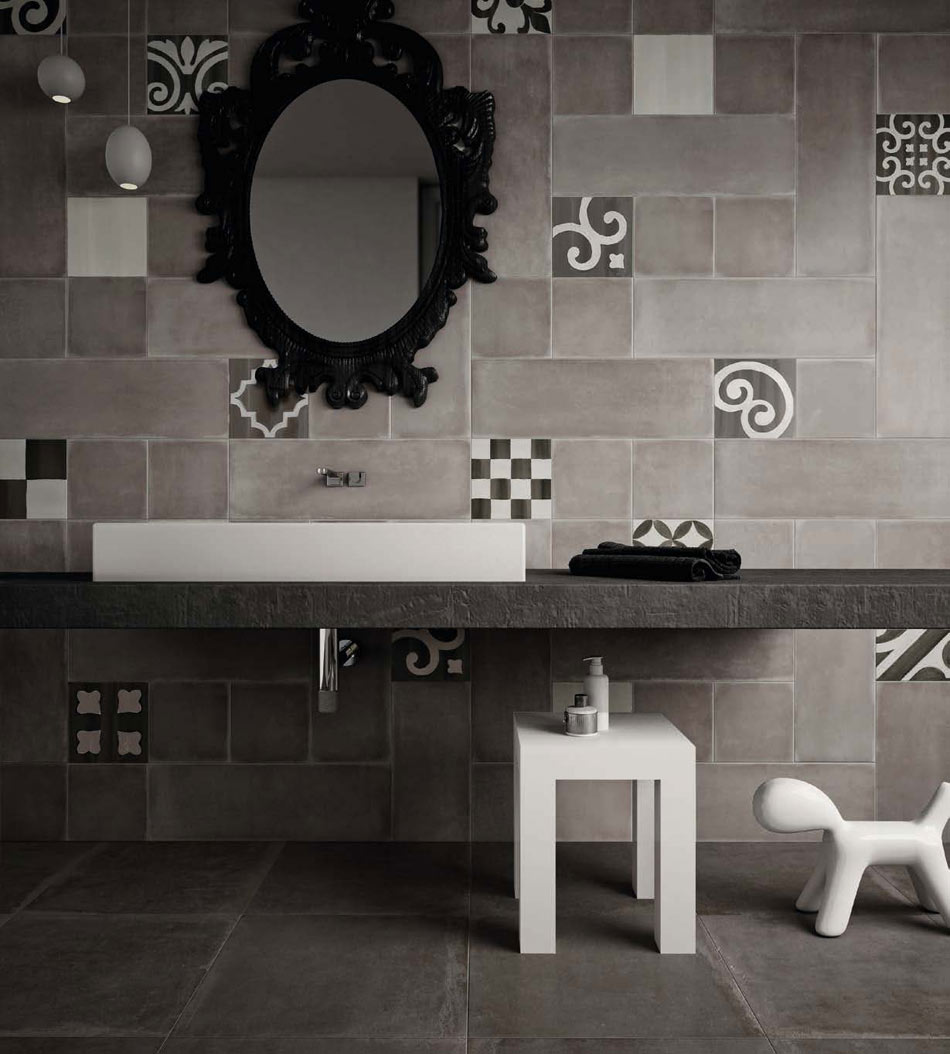 A bathroom backsplash intrigues in patterned tile. The orderly grid allows the individual tile designs to shine, while its randomness relies on unique print placement. The result is a striking balance of muted neutrals and grays that blossom in diamonds, swirls, and pinwheels.