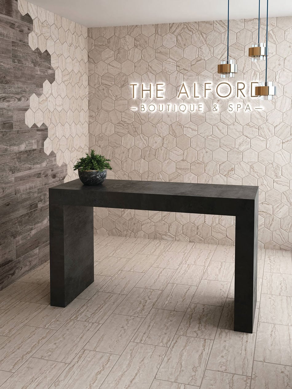 A boutique lobby masters random tile design in a transition between shapes and textures. Creamy marble-look hex mosaic tile climbs the wall, meeting rustic wood-look tile. Staggered tile transitions echo natural movement and work particularly well with hexagon tile. Marble-look floor tile continues the soothing vibe in an offset subway layout.