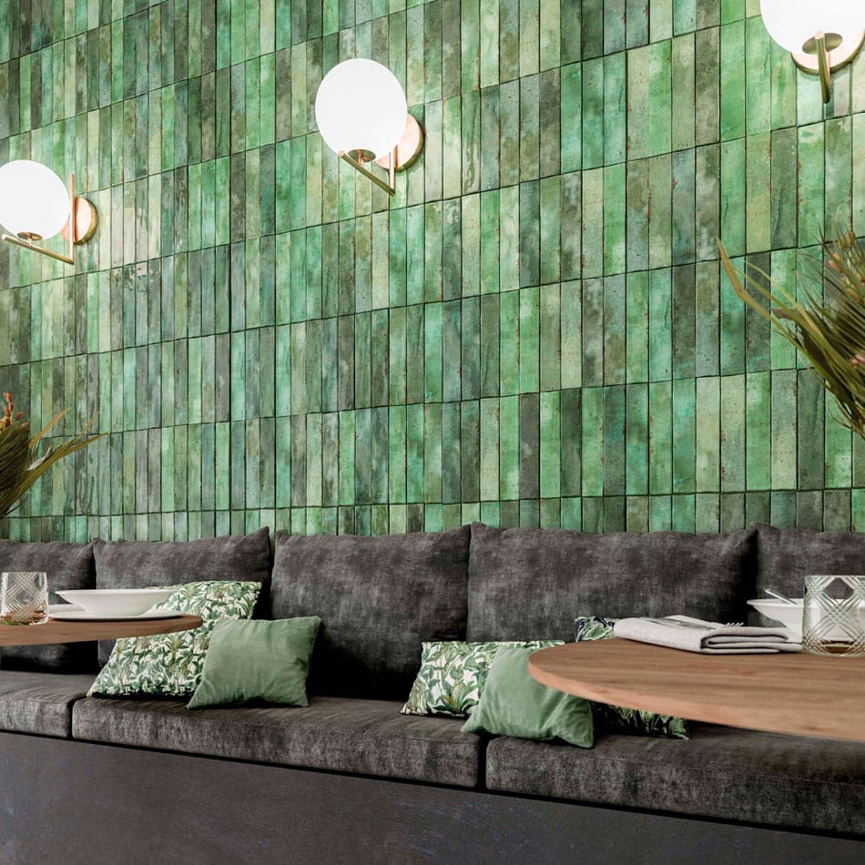 A café wall proves randomness doesn’t always come from layout; it’s built right into the tile. Slim rectangular tiles in moss and emerald shades line up neatly in a vertical grid. The tile’s color variegation creates a rich flow reminiscent of foliage.