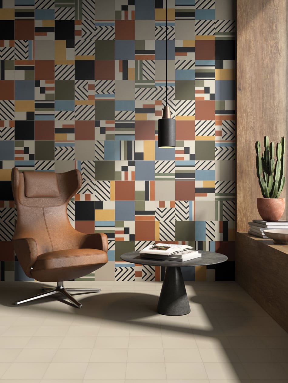 A random tile pattern or layout works best when you distribute elements evenly. Think light and dark tones, smooth and textured finishes, large and small shapes, visual negative and positive areas, printed and uniform panels.