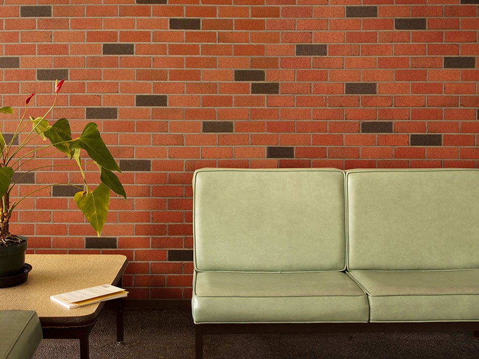 Brick-look tile in rich, earthy shades forms the base of this waiting room wall. Chocolate-brown tiles randomly punctuate the layout, placed just enough to feel purposeful. The effect? A space with panache and personality where you might not otherwise enjoy sitting a spell.