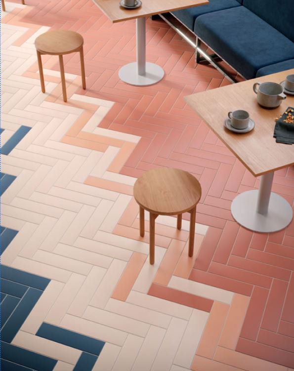 A bold herringbone layout zigzags to and fro on this stylish café floor. Blush and pink tiles mark seating, pastel pink defines walking areas, and midnight-blue tile transitions to another area. This random tile design is especially refreshing: Each tile color takes measured steps without visual clutter.