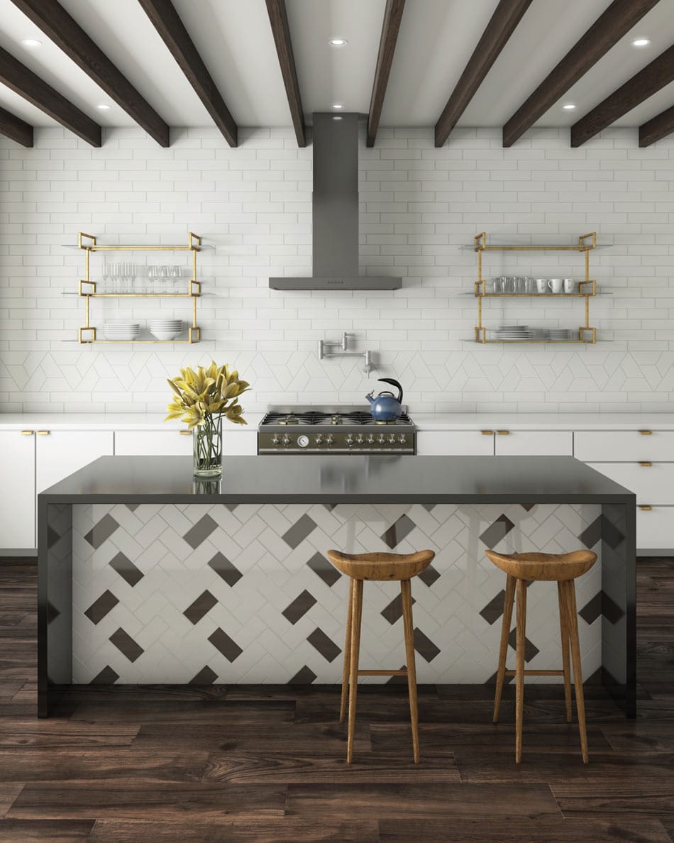 The island’s herringbone layout sports deep gray accents, carefully staggered throughout bright white tile. A triangular accent course is subtly snazzy on the wall, sandwiched amid white subway tile layers.
