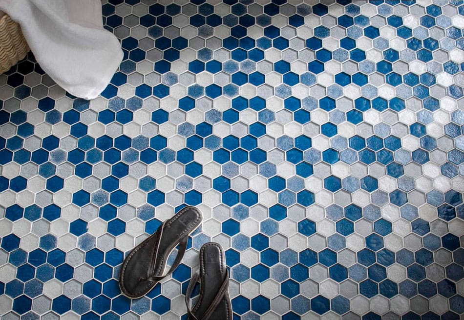 This oceanic hex tile mosaic is exactly what you need to liven up a bathroom floor. The random pattern comes from a delightful mix of white, gray, and cerulean blue.