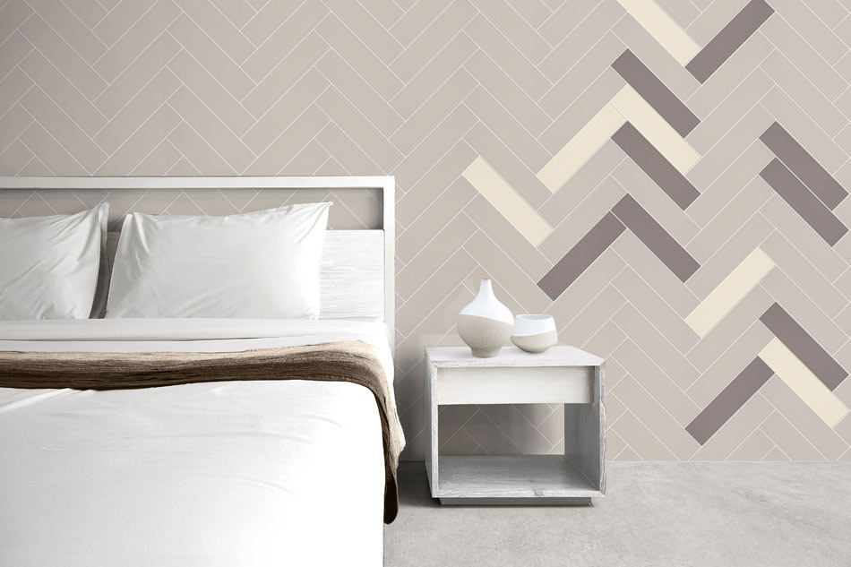 Random strokes of brown and bone-white tile punctuate a neutral beige bedroom wall. The effect is captivating, even echoing peaceful biophilic design in a chic herringbone layout. White grout plays a key role in unifying the design, neatly framing each matte tile.