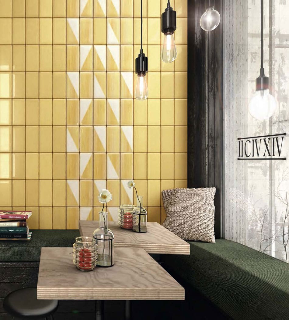 This restaurant wall takes a deliciously biophilic bent via random tile design. Beaming zellige tile undulates in yellow; some tiles are bicolor, creating soft white triangles amid the expanse. The overall look evokes flower petals falling through shafts of sunlight onto cut grass.