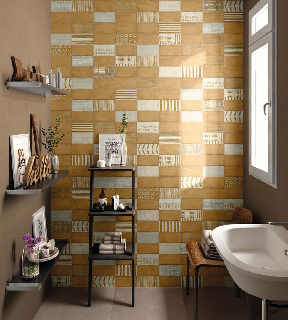 This bathroom accent wall is anything but ordinary with a floor-to-ceiling random tile design. Tiles patterned with dots, stripes, and grids sit among variegated amber-yellow tiles. That sunny color family keeps the eclectic mosaic cohesive (and gives a small space big personality).
