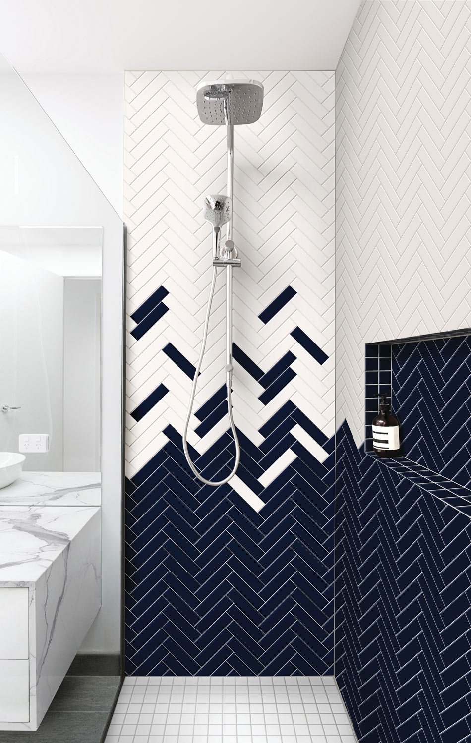 Color-blocking and random tile design meet masterfully in this bathroom shower. Herringbone wall tile in deep navy moves to bright ivory in a staggered layout. Think: cresting wave. Consistent bright-white grout holds the design together as it moves the eye up and up.