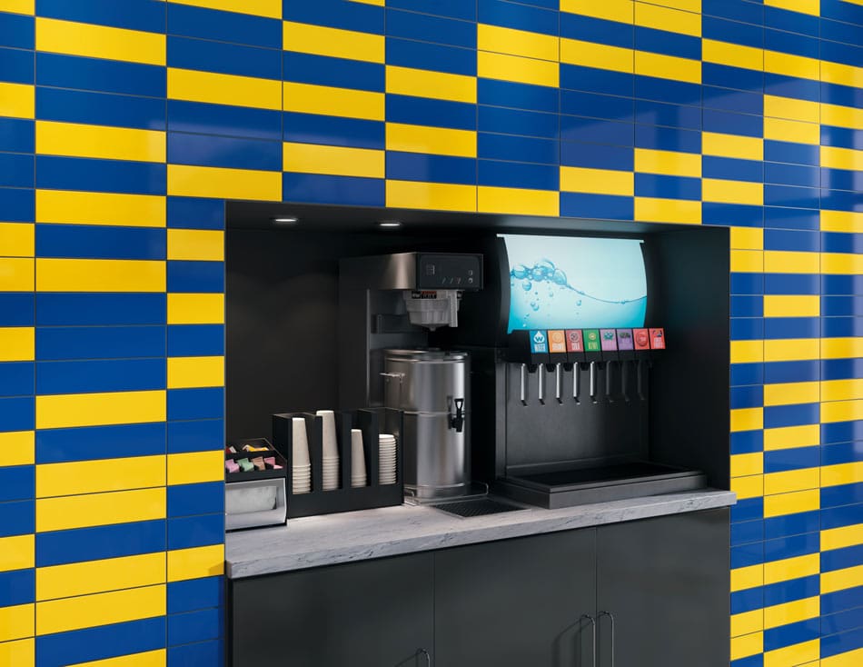 This store’s beverage area bathes its wall in high-shine, brand-specific royal blue and dandelion yellow tile. Tall panels with horizontal lines summon movement while not overwhelming the gaze of thirsty customers.