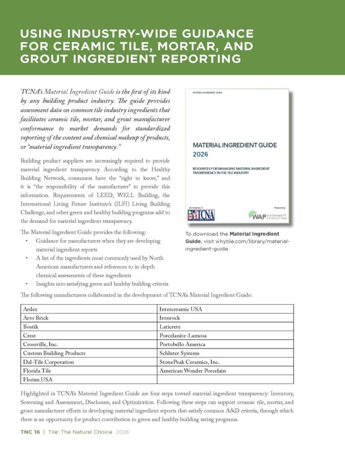 Highlighted in the Tile Council of North America’s Material Ingredient Guide are four steps toward material ingredient transparency: Inventory, Screening and Assessment, Disclosure, and Optimization. Following these steps can support ceramic tile, mortar, and grout manufacturer efforts in developing material ingredient reports that satisfy common A&D criteria, through which there is an opportunity for product…